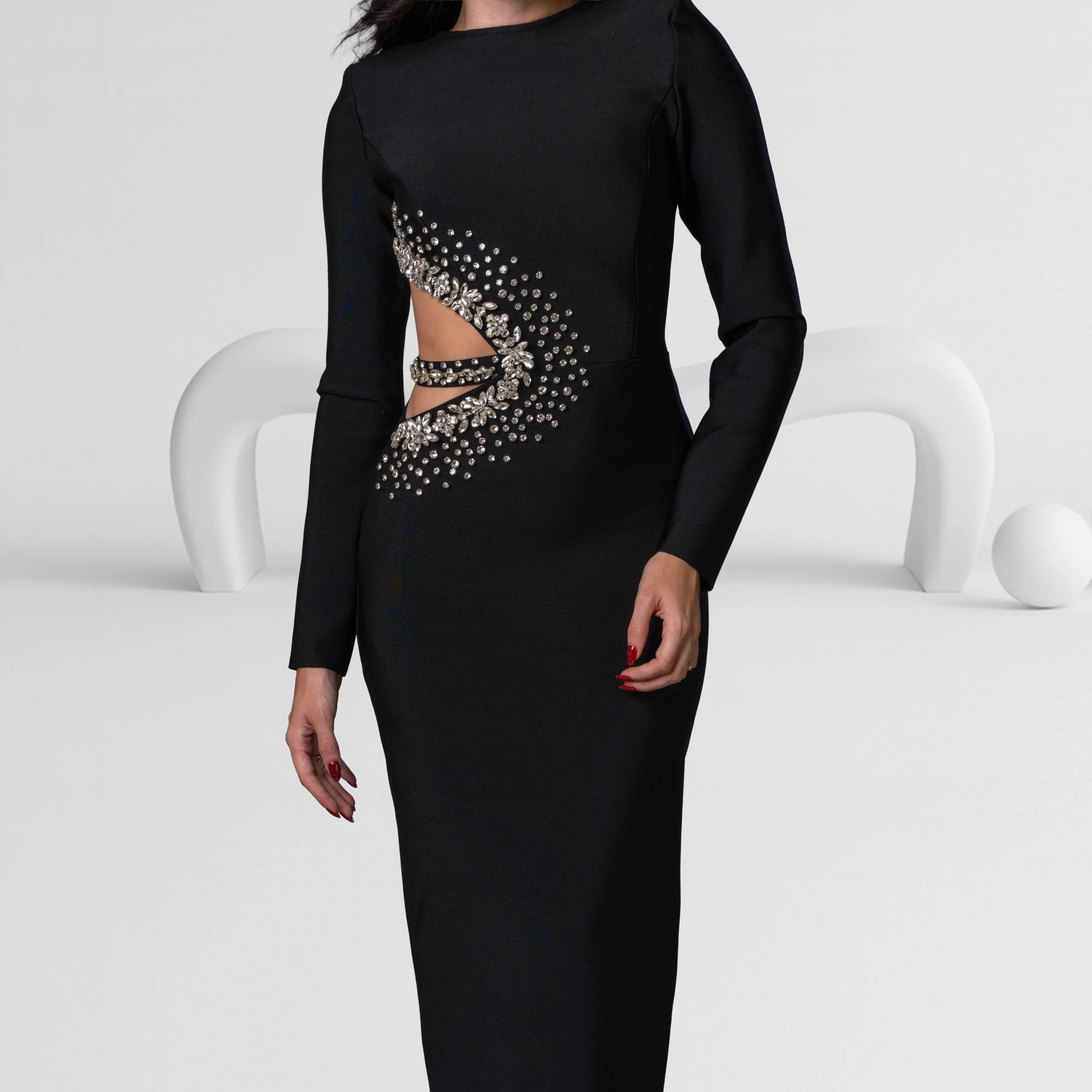 Evening Dress Long Sleeve with Cut-Out and Beaded Detail Color Black