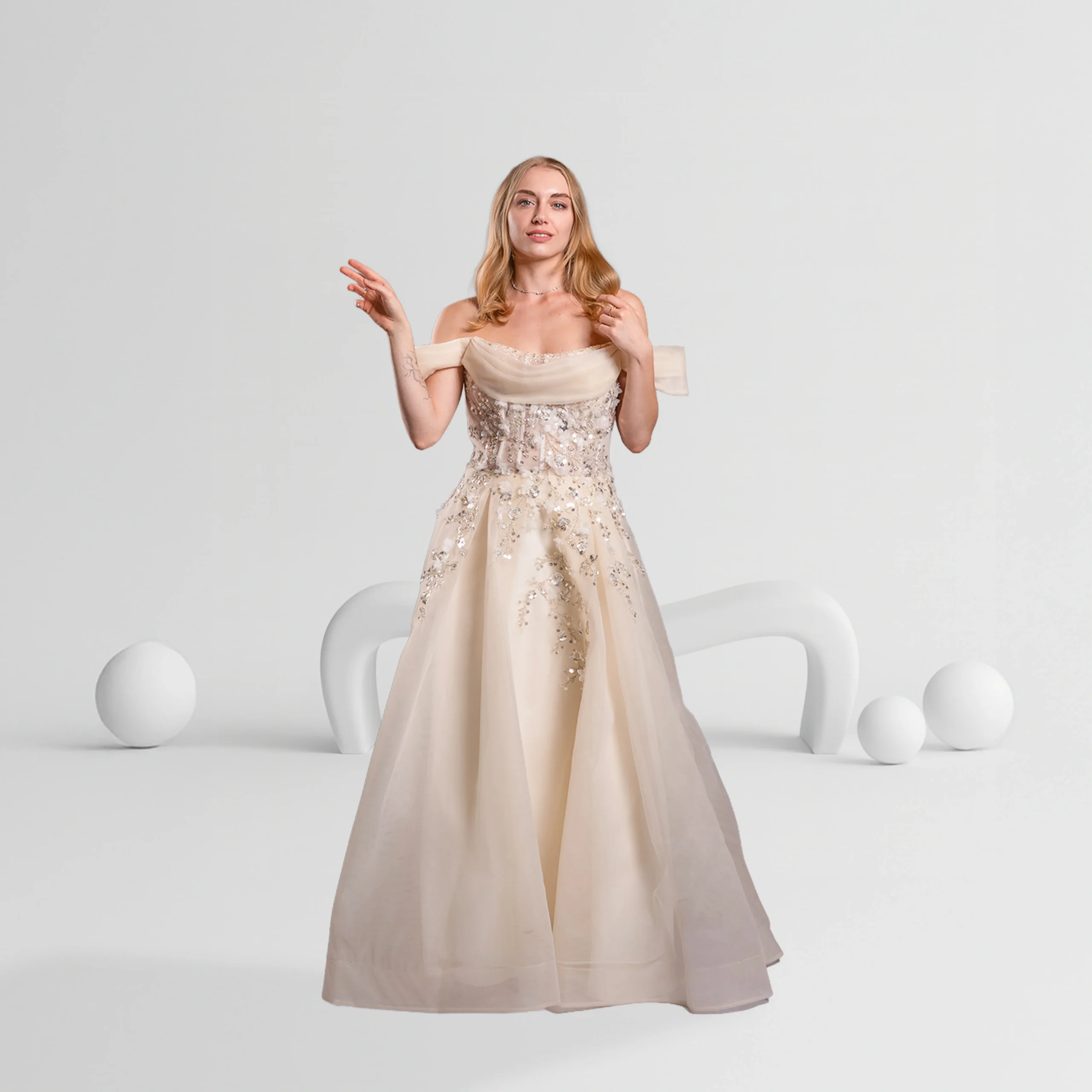 This elegant evening dress comes in a delicate champagne color and is made in a comfortable Medium size. The off shoulder neckline highlights your shoulders, while the semi sheer bodice is decorated with sparkling beads and floral details that add a touch of glam without feeling heavy. The skirt falls in soft layers into a graceful A-line shape, giving the champagne dress a light movement with every step. The Medium fit is designed to flatter the figure and keep you comfortable, making this gown perfect for engagements, parties, and special occasions where you want a refined and romantic style.