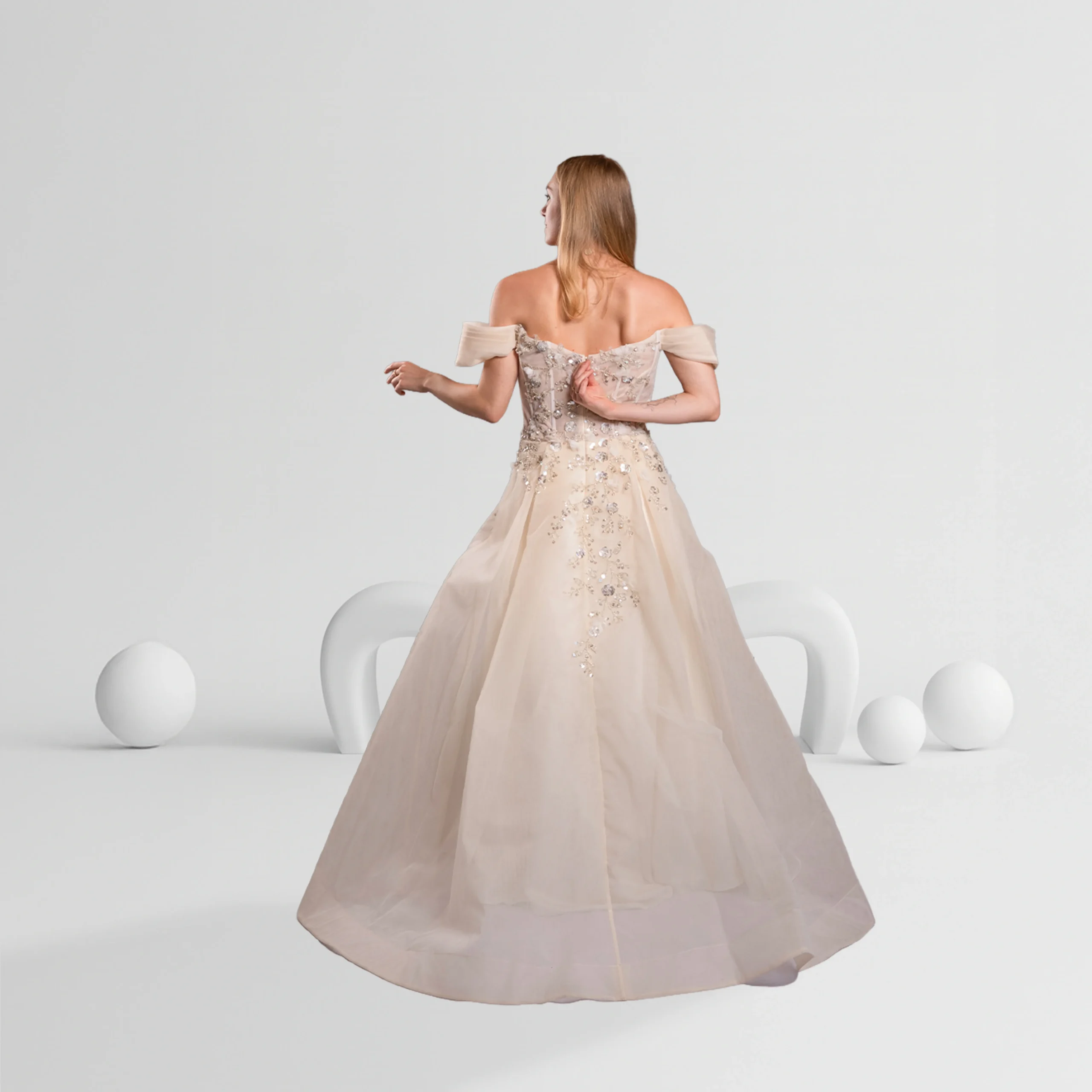 Romantic off shoulder evening dress in a soft champagne color, size Medium, with a fitted embellished bodice and flowing A-line skirt for a classy, feminine look.