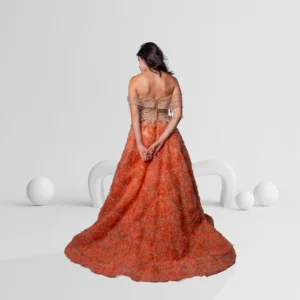 This stunning evening dress in orange combines glamour with drama. The off-shoulder bodice is adorned with intricate beadwork, creating a sparkling, luxurious effect. The full skirt is made of soft floral fabric, creating a voluminous, princess-like silhouette. Designed in a Medium size, this dress offers a flattering fit while ensuring comfort and elegance. Ideal for grand events, galas, or red-carpet appearances, the dress’s vibrant orange color and detailed beading make it a show-stopping choice for those seeking a statement-making gown.