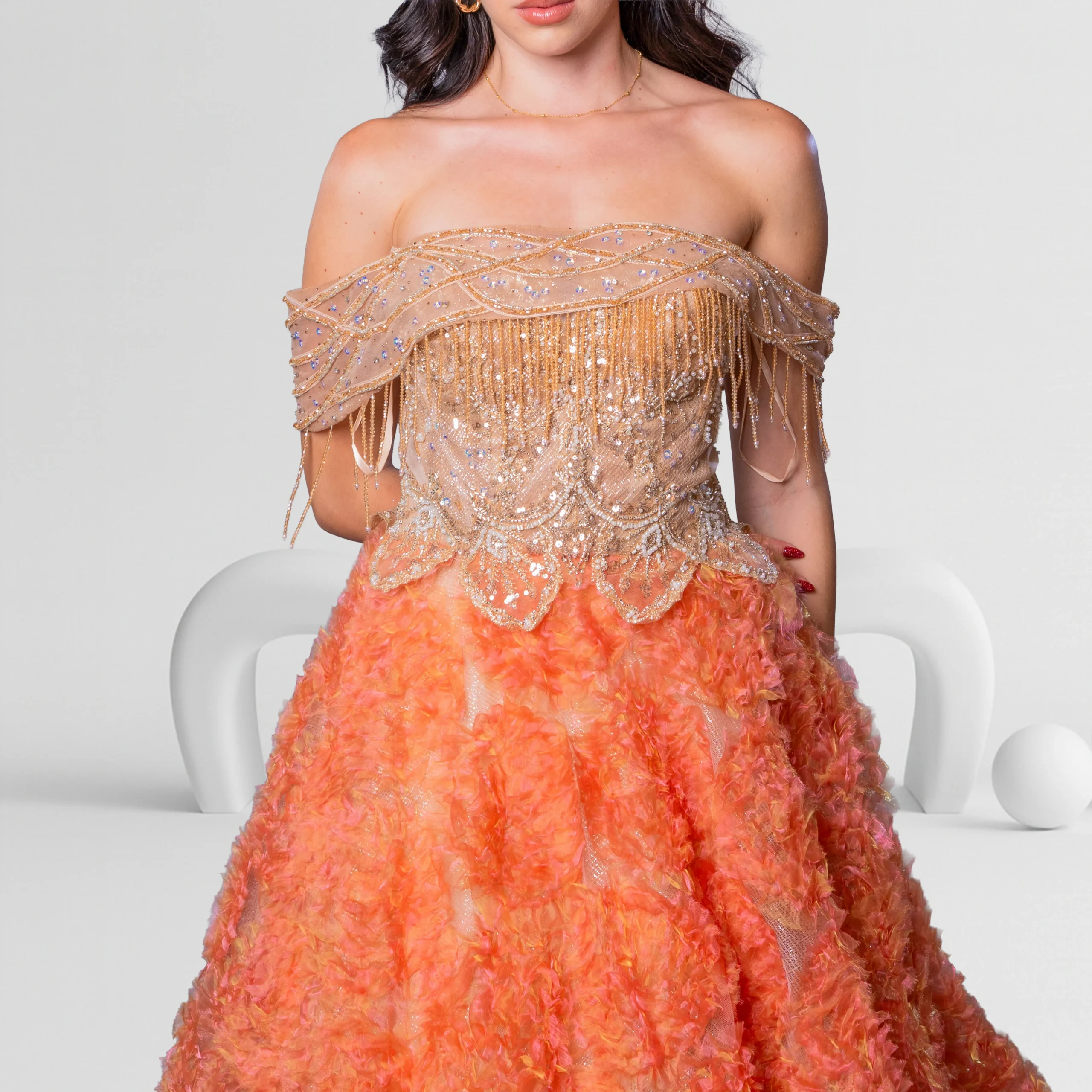 Evening Dress Off Shoulder with Beaded Top Color Orange
