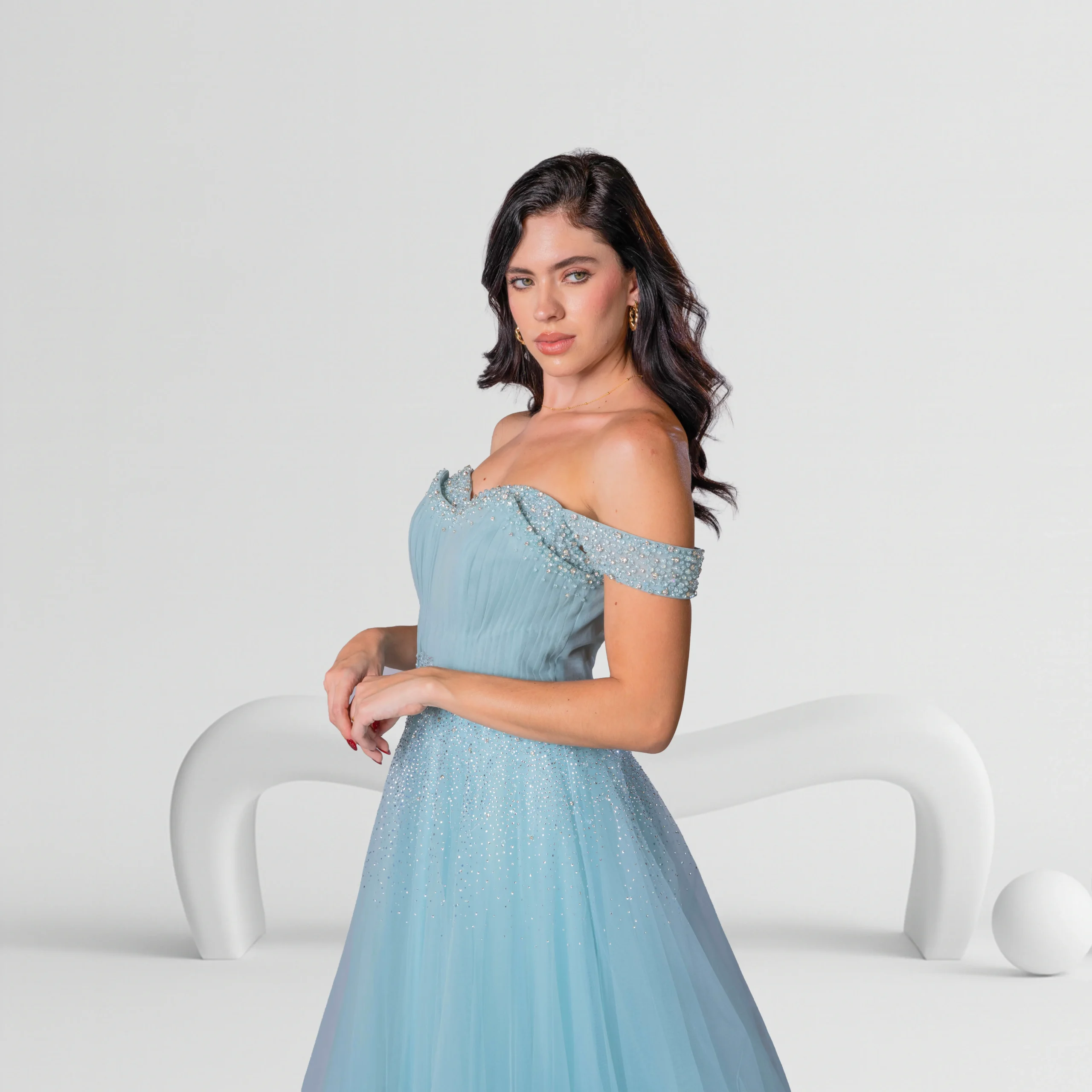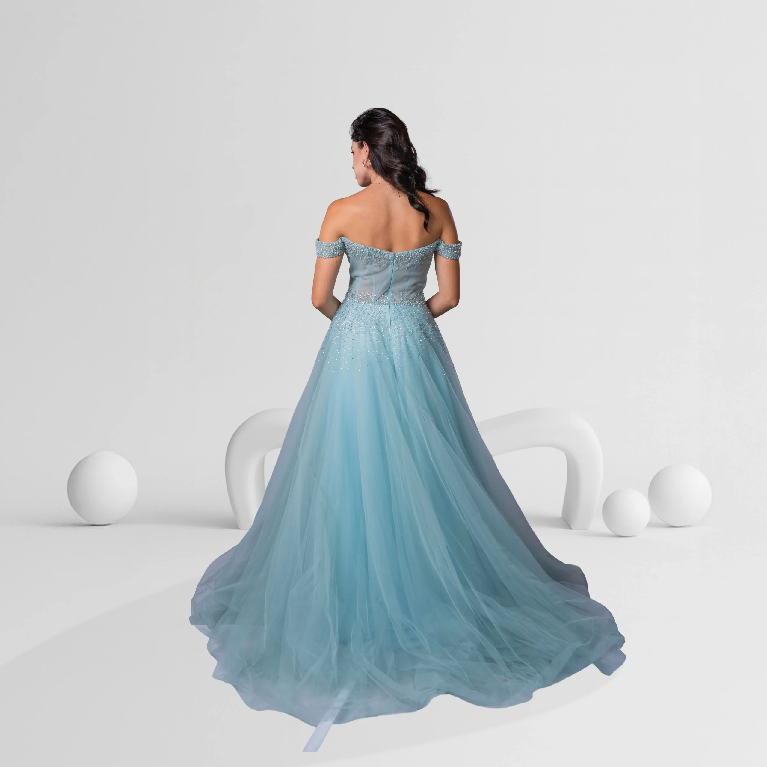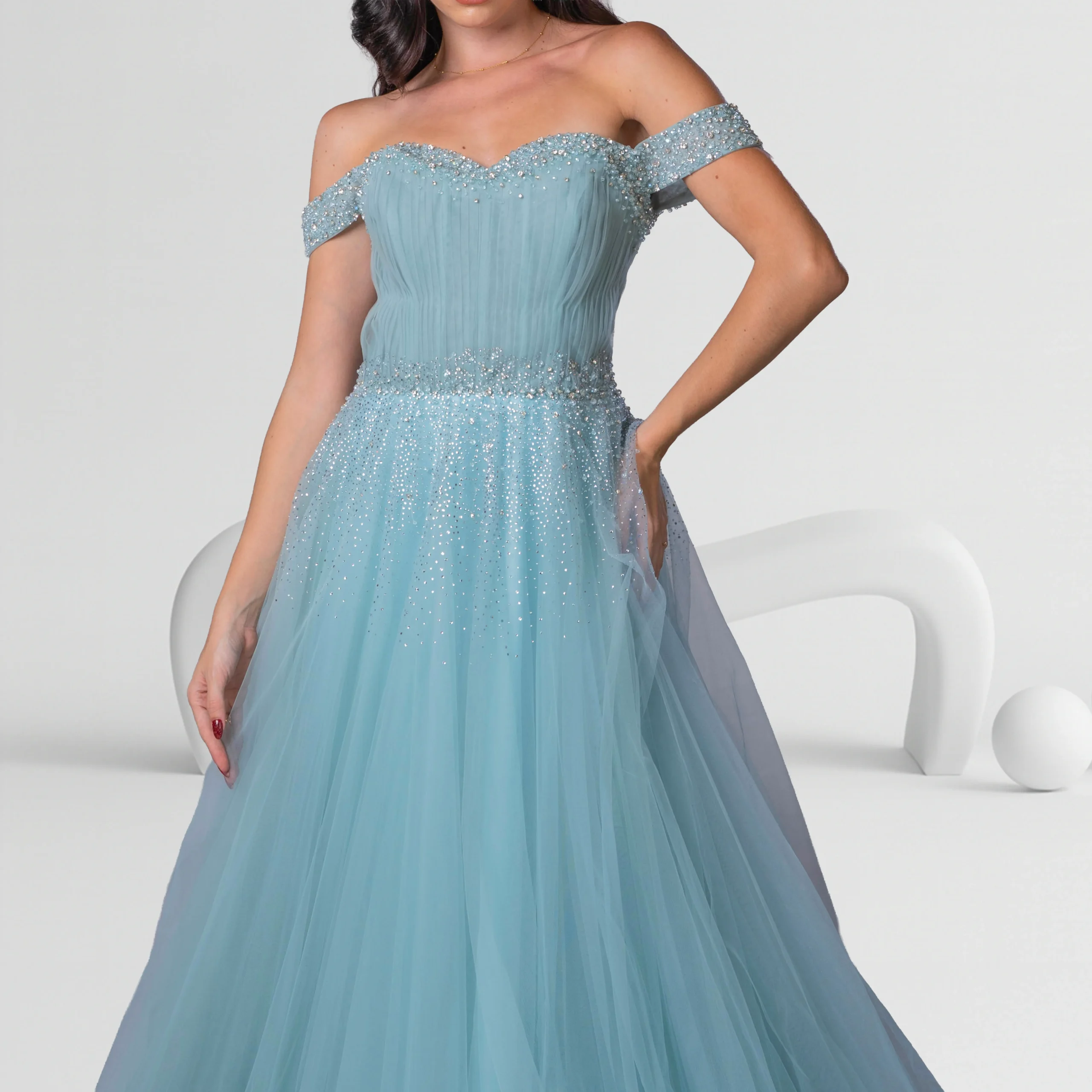 This enchanting evening dress in light blue features an off-shoulder design with a flattering Medium size fit. The bodice is adorned with delicate beadwork at the waist, which adds a touch of sparkle and elegance. The flowing tulle skirt creates a voluminous silhouette, enhancing the dress’s ethereal, romantic appeal. Perfect for weddings, galas, or any special occasion, this dress will make you feel like a princess. The Medium size ensures both comfort and style, while the soft light blue color evokes a timeless, sophisticated beauty.